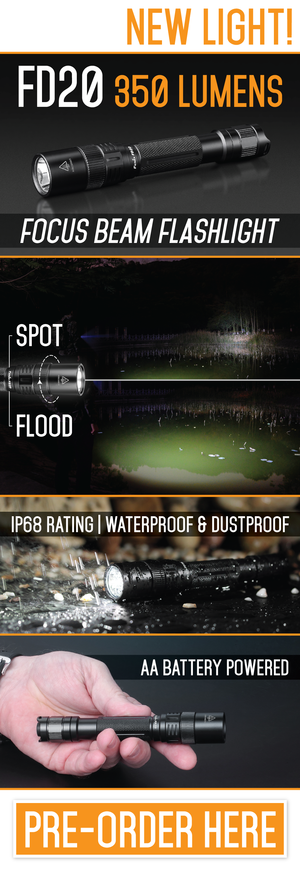Demand for a focus beam flashlight is very high--announcing an AA battery-powered, focus beam flashlight. Fenix FD20! YOU have more control over the beam pattern in a flashlight powered by a commonly found battery. You actually have three battery options! Oh the choices you have now. Operator control is good!