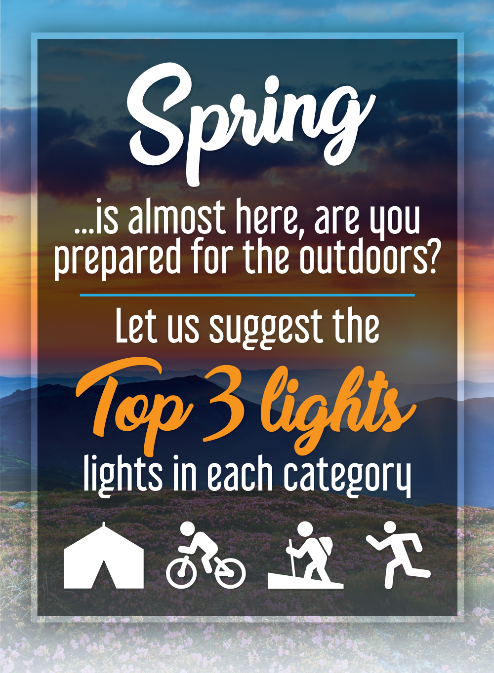 The weather is warming so it's time to conduct an inventory of your lighting gear. Lots of new products are available since last year. Whether you are into camping, cycling, hiking, or running--we have our top suggestions for you. Refresh your gear and get out side!