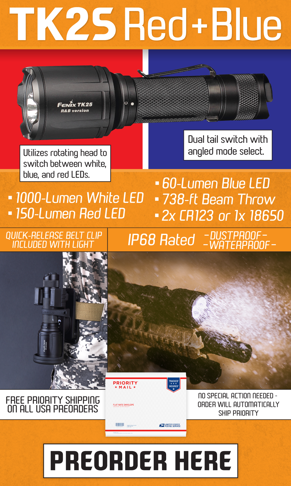 Everyone please welcome the Fenix TK25 R&B! This new tactical flashlight offers a white, a red, and a blue LED! The TK25 R&B includes a 1000 lumen white LED with two outputs with the red LED and one output with the blue LED.